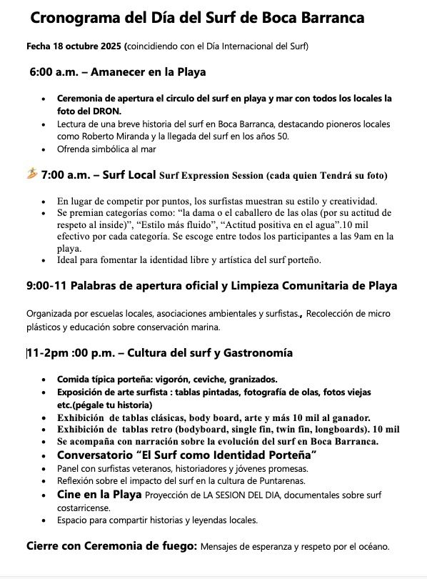 La iniciativa presentada por la Regidora, Sindy Giovanna Scafidi Ampié, quedó en firme durante la sesión del pasado 2 de octubre. Según el oficio MP-SM-AC-961-10-2025 de la Secretaría del Concejo porteño esta propuesta surgió como un esfuerzo de un colectivo de ciudadanos puntarenenses, incluyendo surfistas locales y profesionales, comprometidos con el desarrollo económico y la práctica responsable del surf en el cantón”.